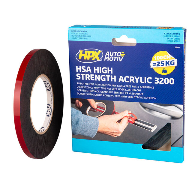 Le ruban acrylique double face HPX est conçu pour fixer solidement et durablement divers matériaux (lourds) tels que les moulures décoratives, les emblèmes, les moulures métalliques, les garnitures, les tôles et les panneaux. Ce ruban constitue une alternative fiable aux vis, rivets, soudures et colles liquides, sans qu'il soit nécessaire de percer.